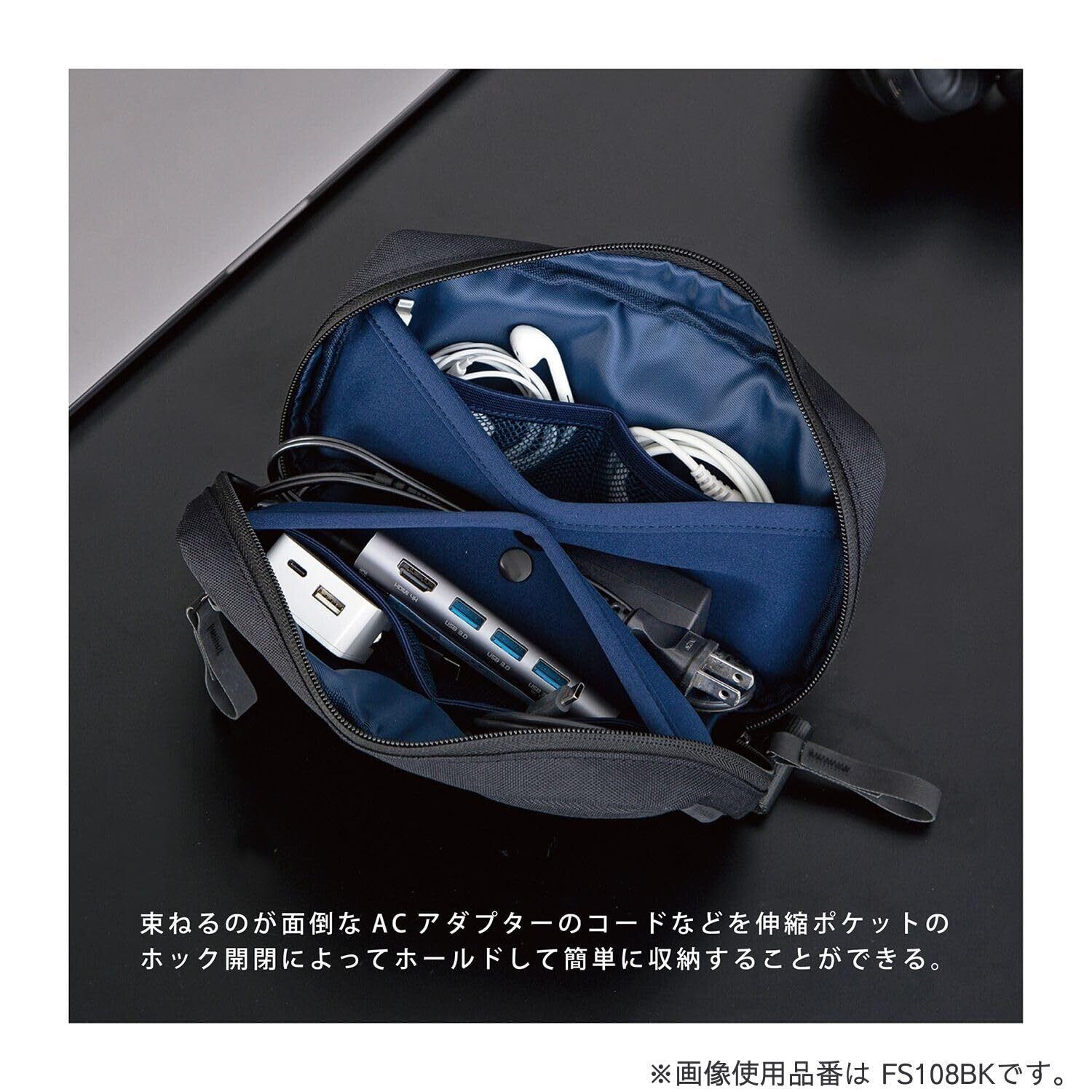【特徴1】伸縮生地ポケットのホック開閉でアダプターをホールドして収納できます