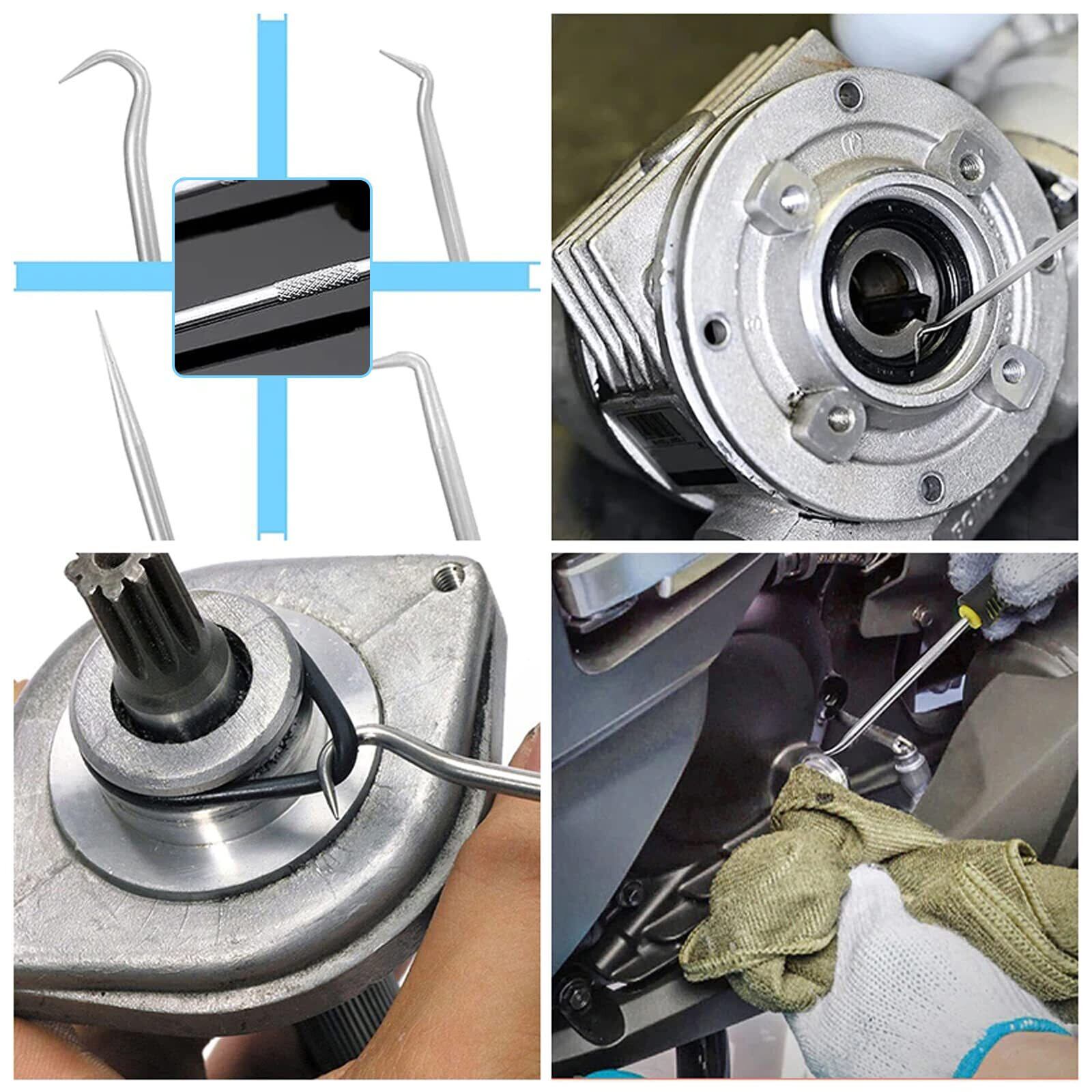 【オイルシールリムーバー】先端が異なる4種類のピック&フックセットです。超微細な先端は、狭い場所で精密部品やねじを正確に調べ、突き刺し、こじ開け、引っ張り、配置することができます。
