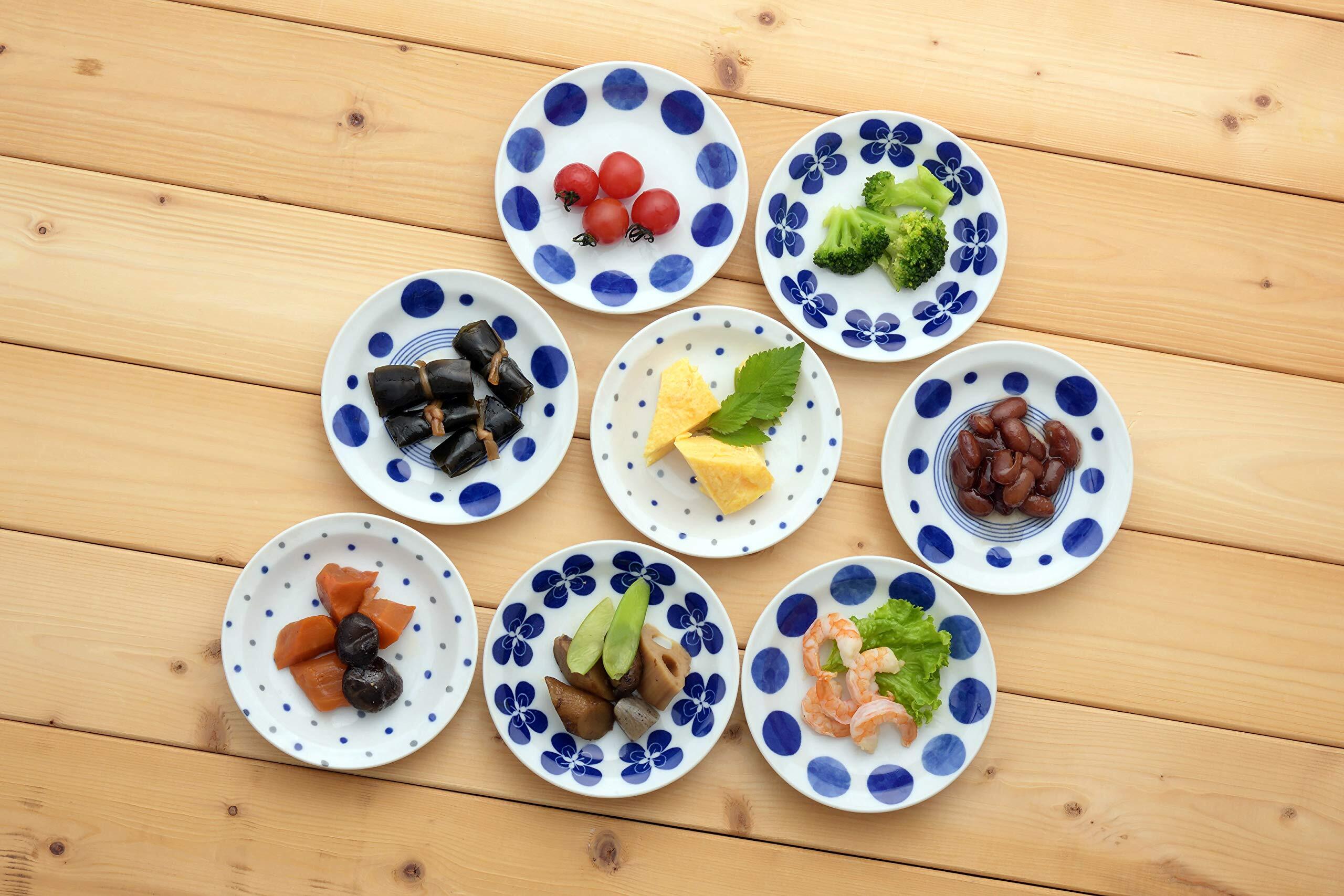 電子レンジ・食洗機OK! 青色で描かれたかわいらしいデザインの器です。いろんなシーンで使えて何かと役立つ小皿。ちょっとしたリム付で持ちやすい形状。スタッキング収納できます。※小皿以外は商品ではありません。