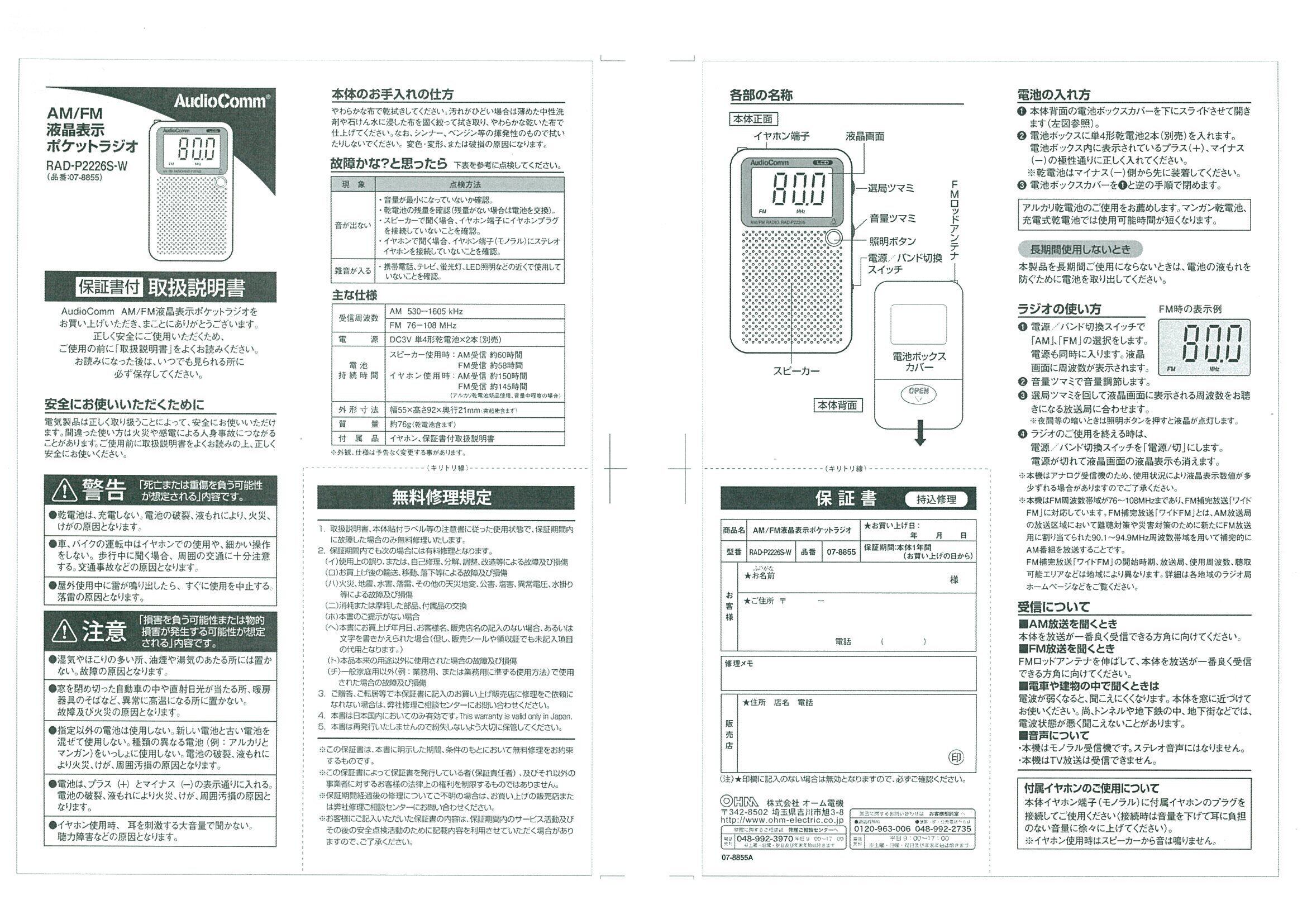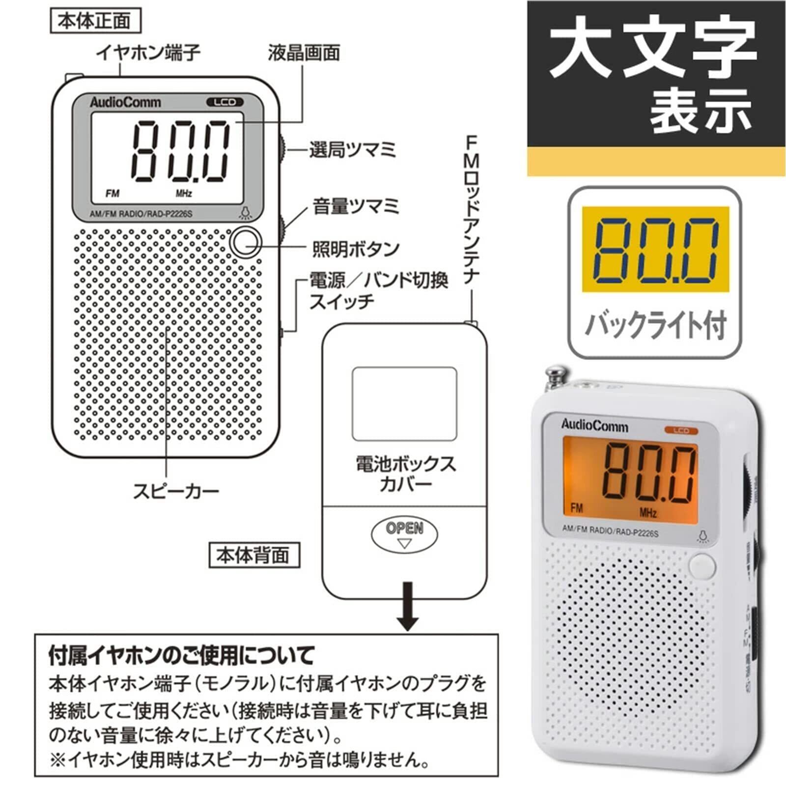 オーム電機AudioComm ラジオ 液晶表示 ポケットラジオ 携帯ラジオ ワイドFM ホワイト RAD-P2226S-W 07-8855 OHM