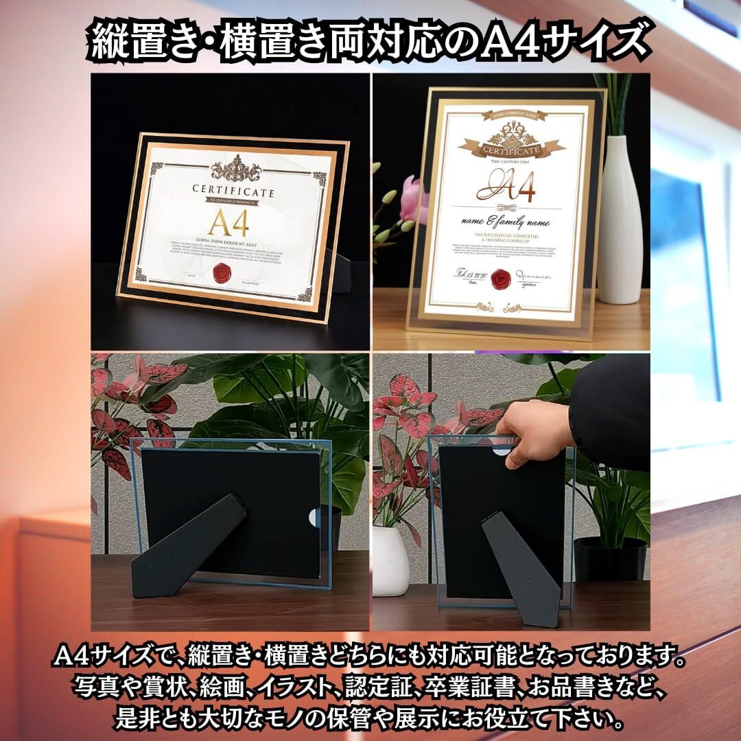 【縦置き・横置き両対応のA4サイズ】縦置き・横置きどちらにも対応可能な、使い勝手の良いA4サイズとなっております。展示物を後ろから差し込むだけで使用できるため、入れ替えも簡単!大きめの写真や証書、賞状、表彰状、ポスター、感謝状、絵画、イラスト、許可証、認定証、免許証、卒業証書など、是非とも大切なモノの保管や展示にお役立て下さい。