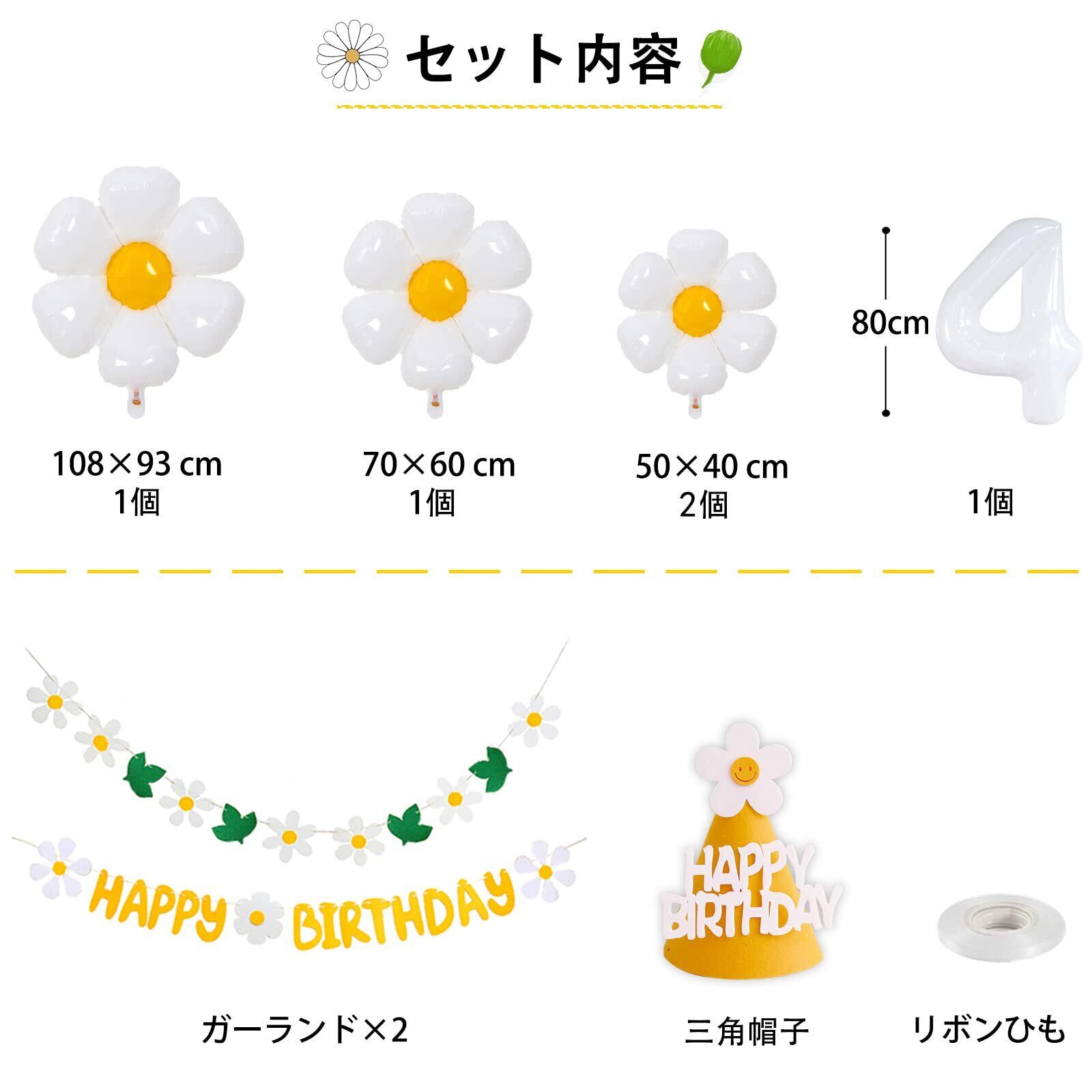 【セット内容】①フェルト布ガーランド×2 ②デイジーバルーン ×4 ③数字バルーン×1 ④三角帽子×1 ⑤リボンひも (10m)
