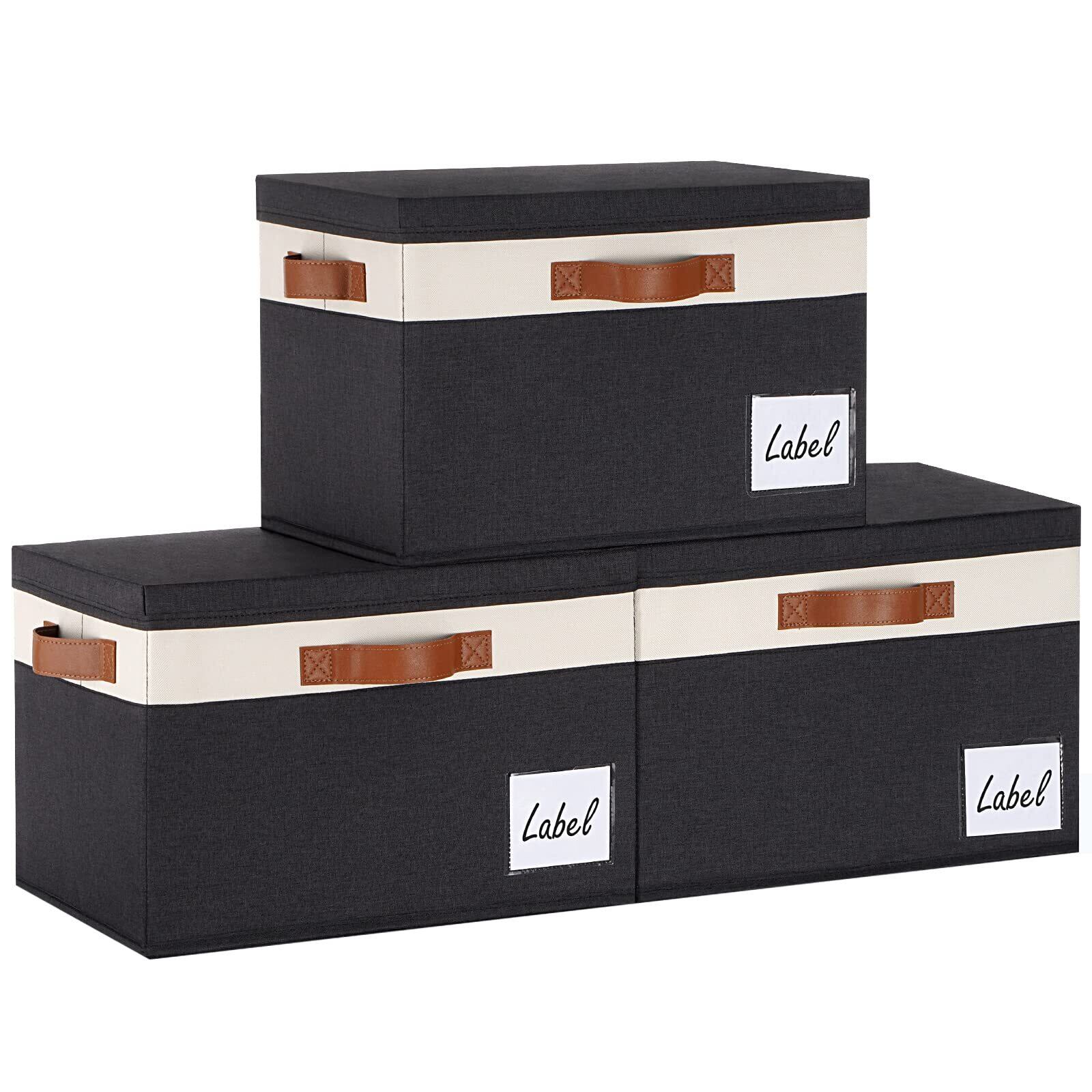 LHZK 収納ボックス 蓋付き 3点セット 大容量 折りたたみ式 収納ケース ハンドル付き 分類用ラベル 丈夫なキャンバス生地 ボックス 大容量整理用 カラーボックス (大きい-蓋付き, 蓋付き - ブラック/ホワイト)